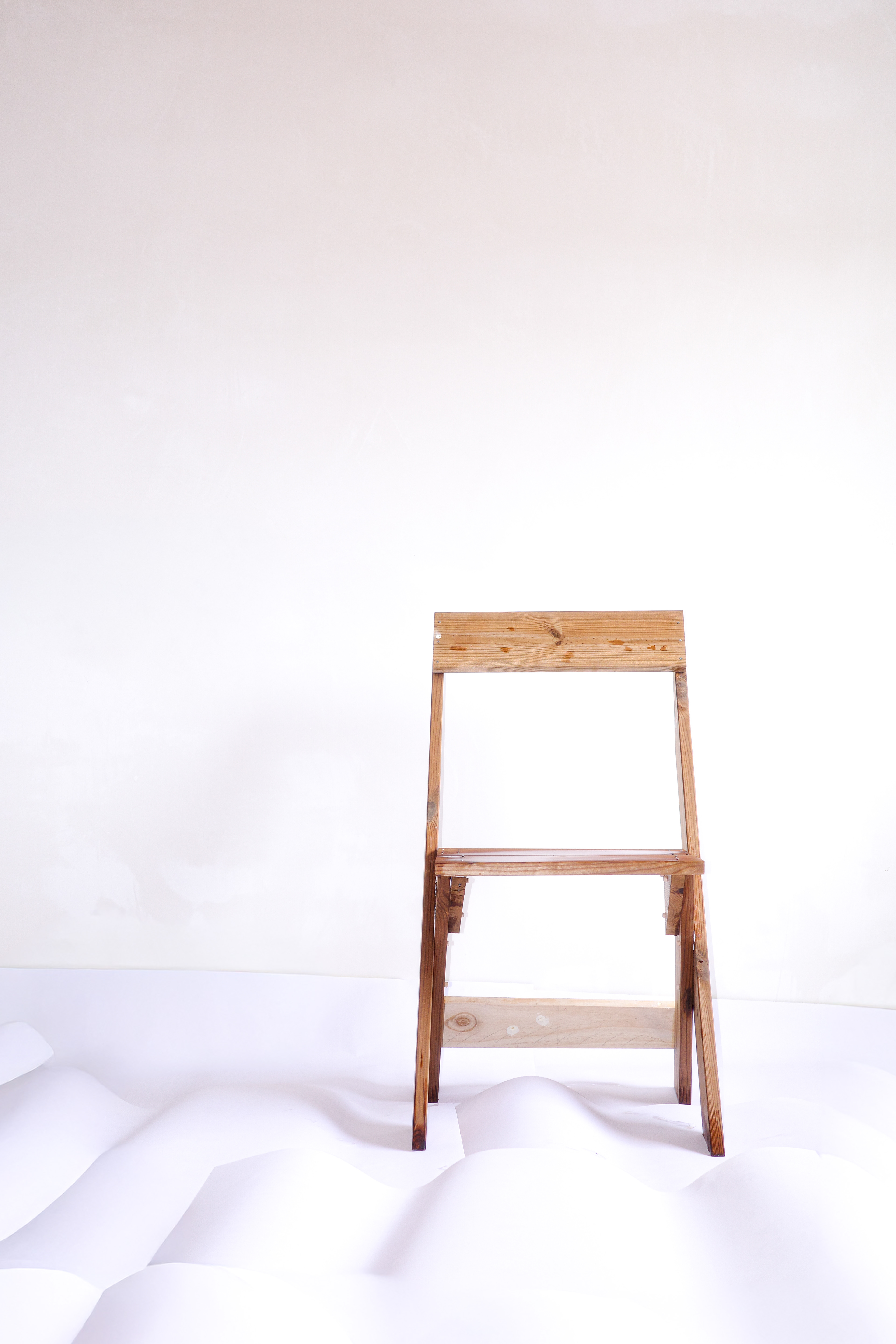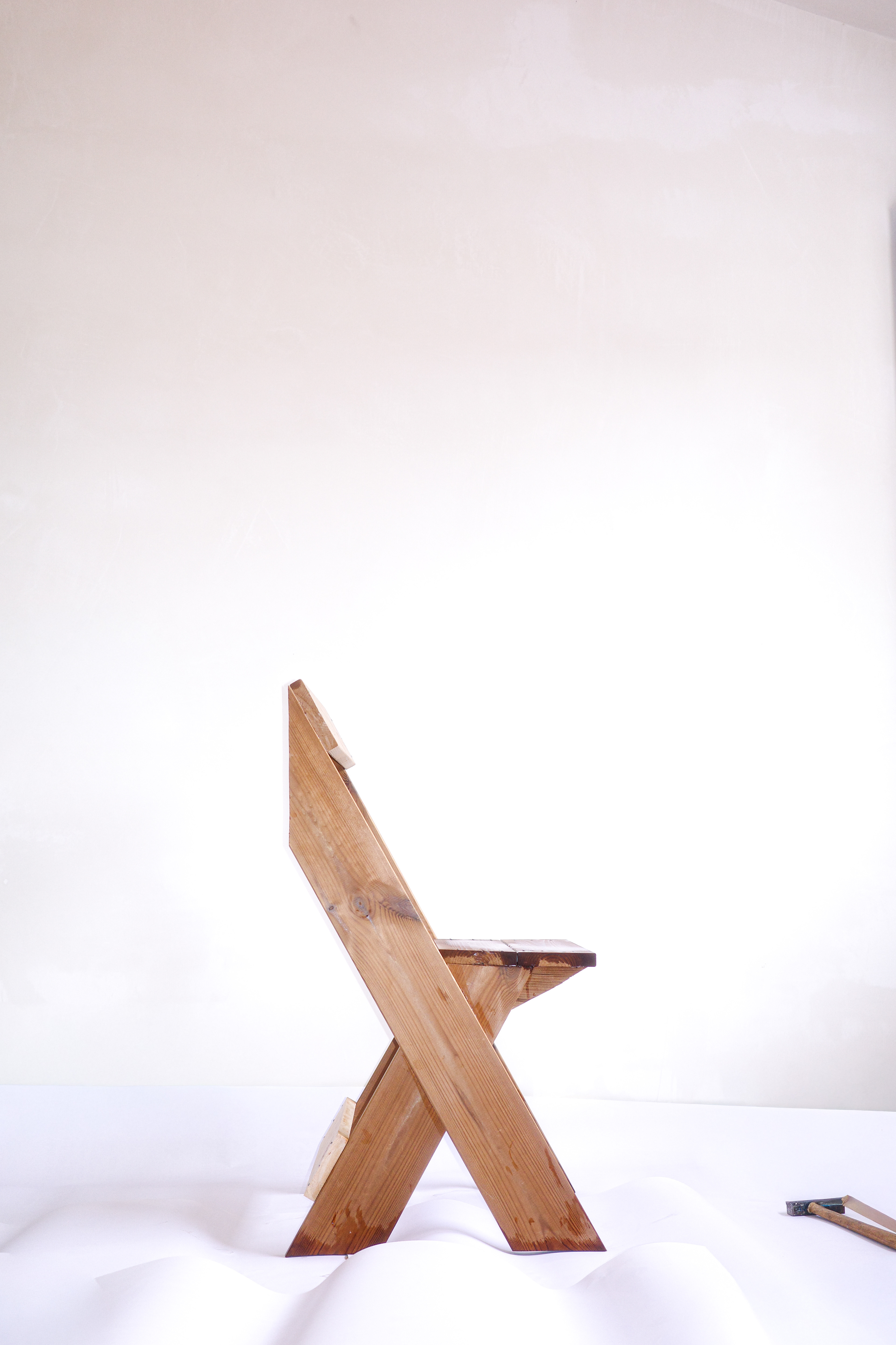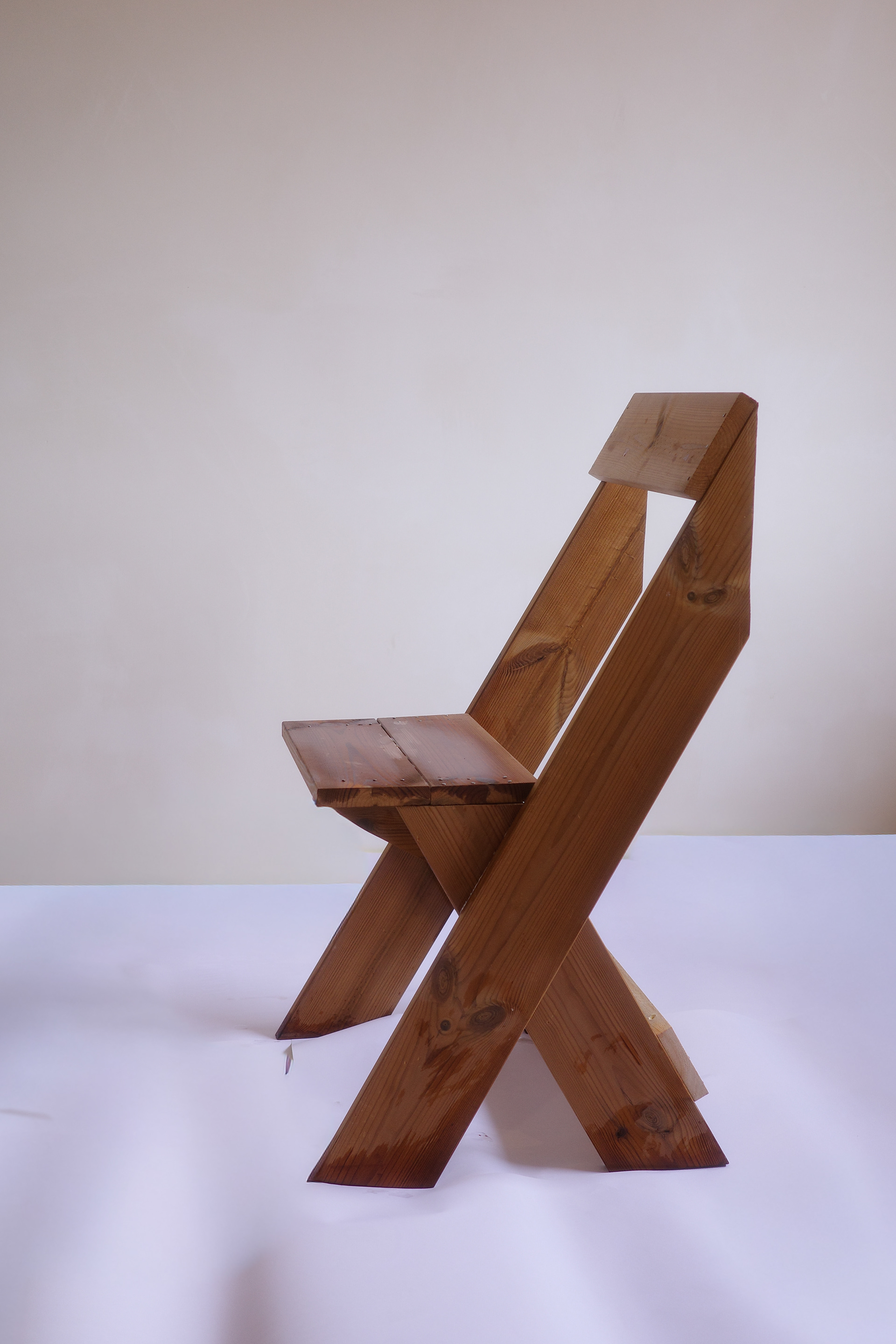 El primer prototip d’una cadira pensada pel exterior i per apilar en tres. Un Perfil individual de Tarima Termopi tractada de secció de 11,5 x 2 de 4,20 de llargada tallada en 7 peces amb reforc de 9,5 x 1,8 de 44,5.