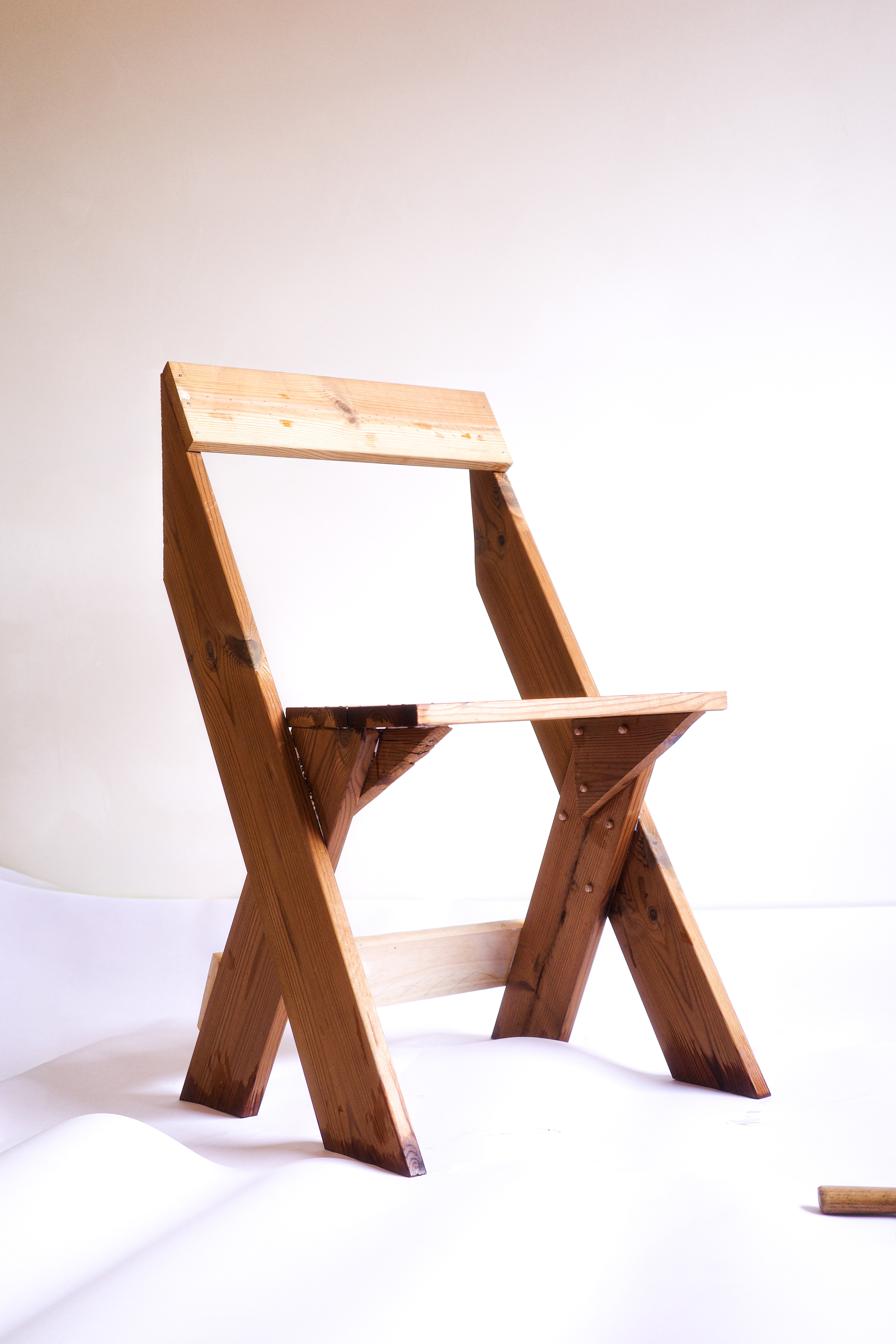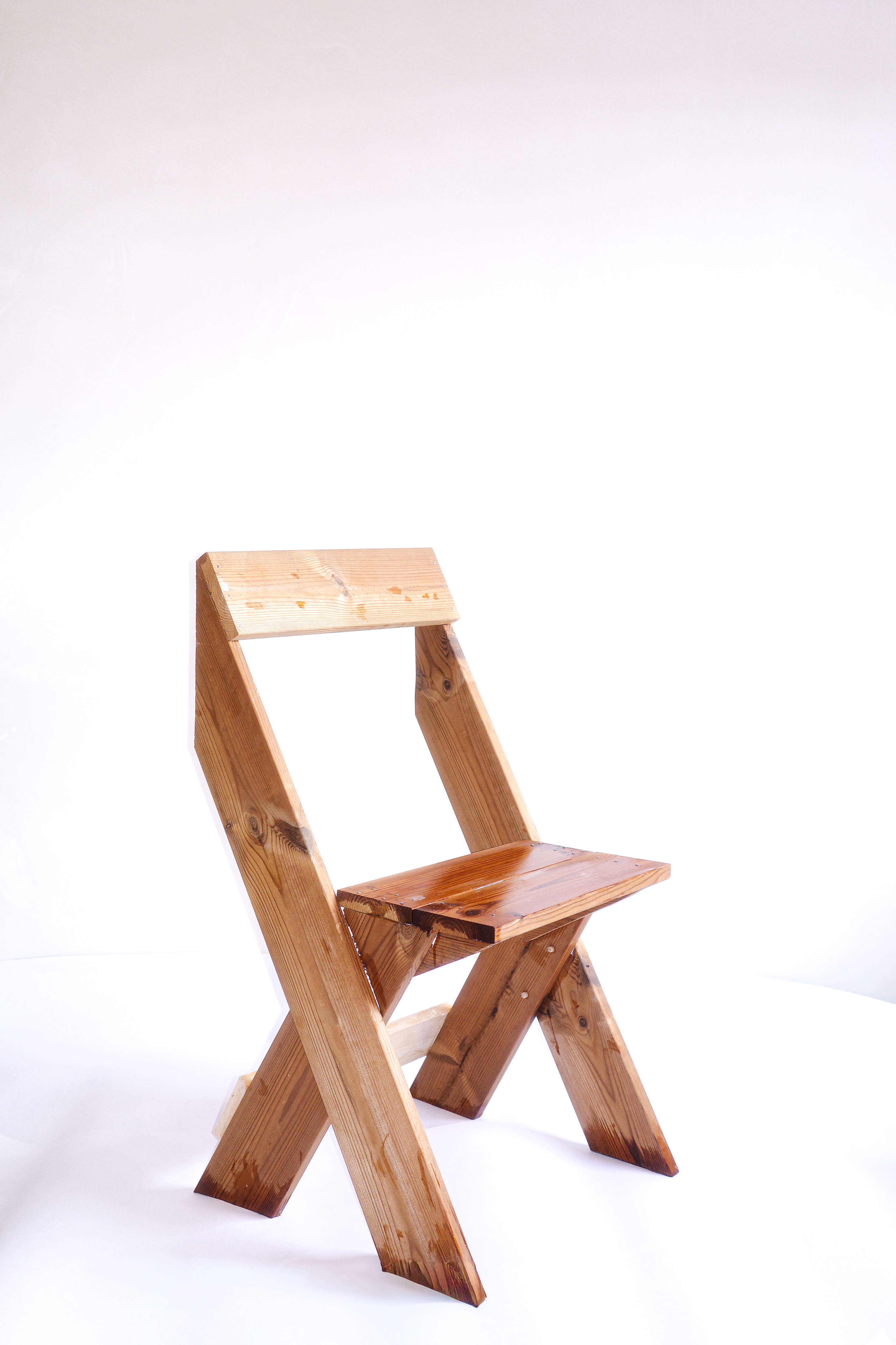 Thermotreated Flanders pine decking wood. The first prototype of a chair designed for the outdoors and to stack in threes. An individual Thermopylae treated decking profile with a section of 11.5 x 2 of 4.20 long cut into 7 pieces with reinforcement of 9.5 x 1.8 of 44.5.